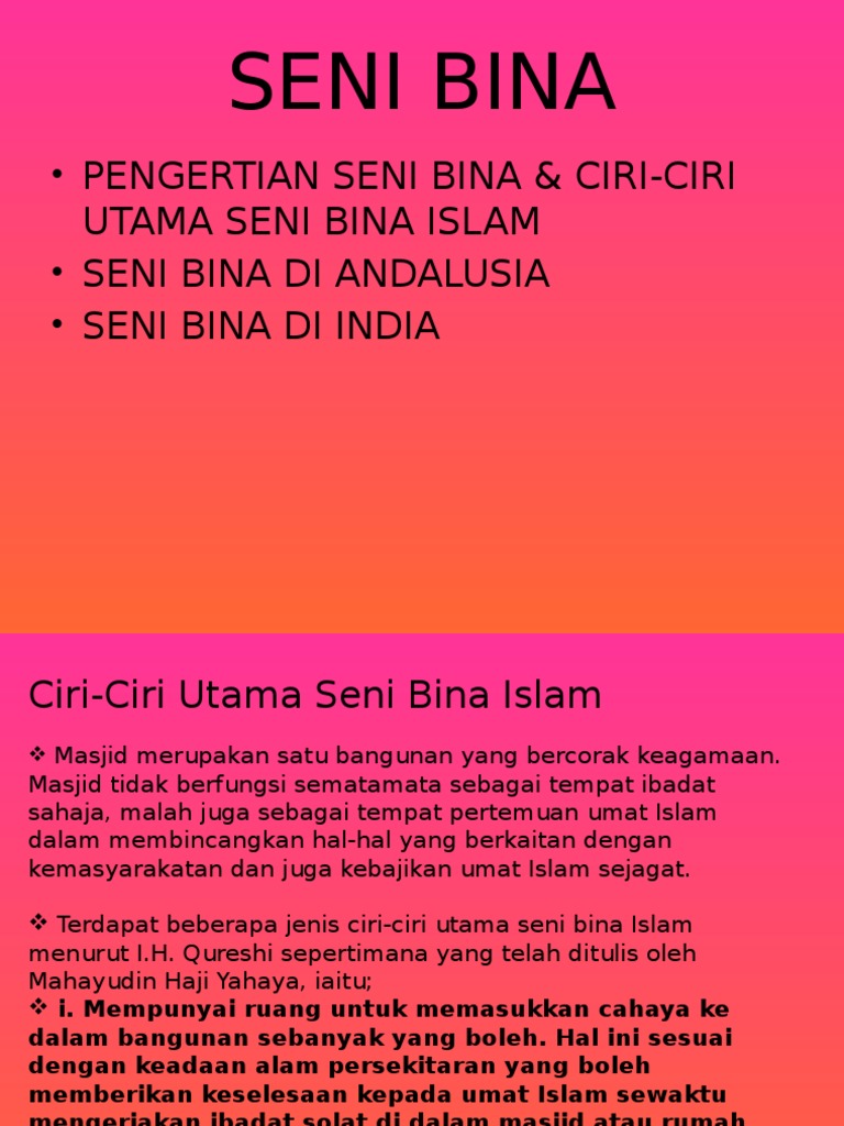 2772010 Apa itu Seni Bina. Justeru itu seni bina Islam sentiasa disanjung dan dihargai kerana matlamatnya ialah untuk meningkatkan keimanan dan ketakwaan kepada Allah. Share SENI BINA everywhere for free.